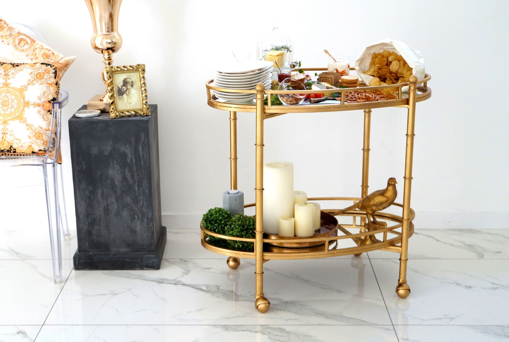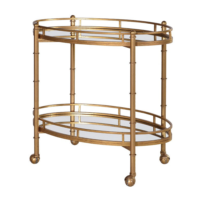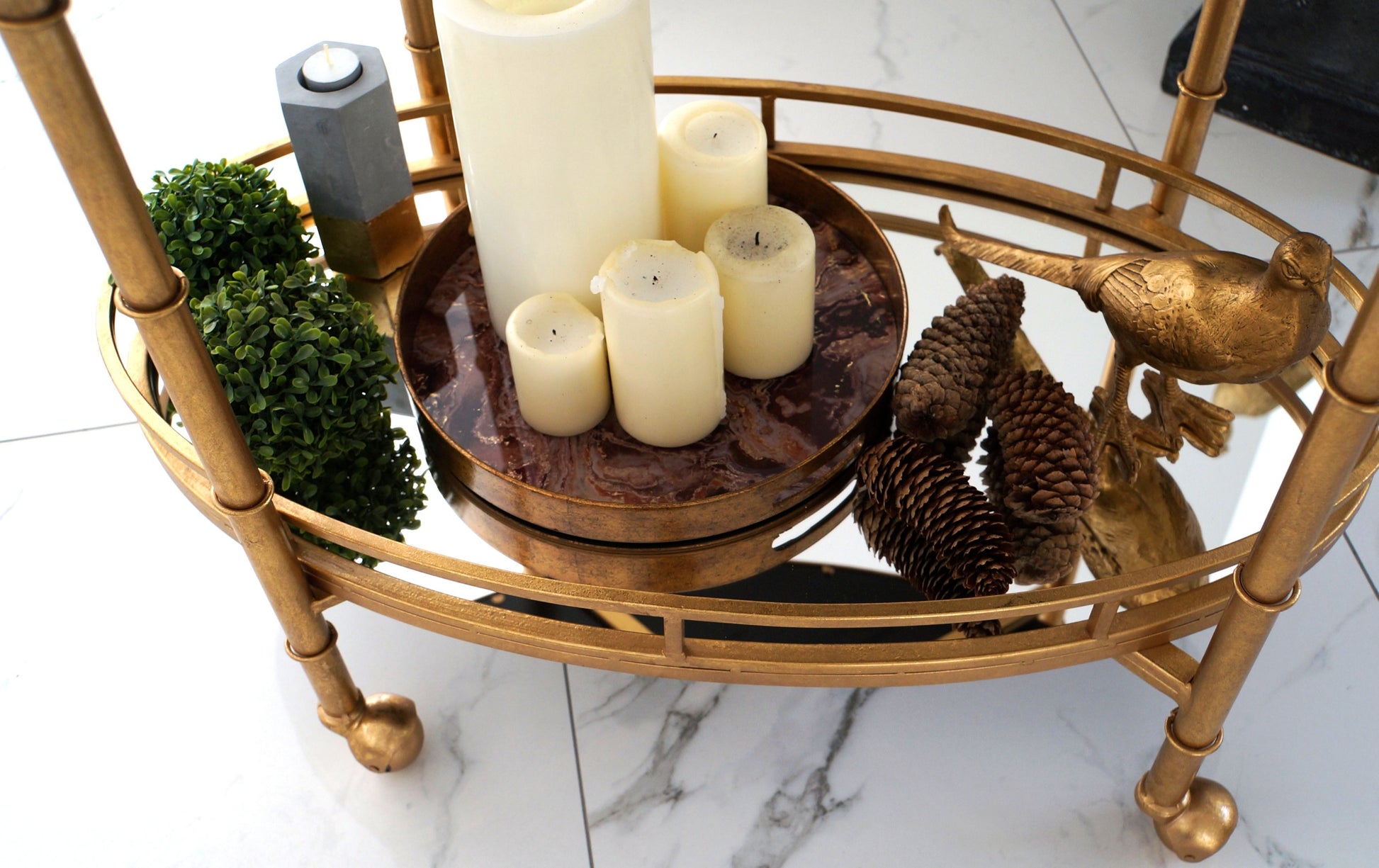 A stunning serving trolley with an elegant gold frame. The mirrored trays are removable and the metal frame folds up for ease of storage and cleaning.