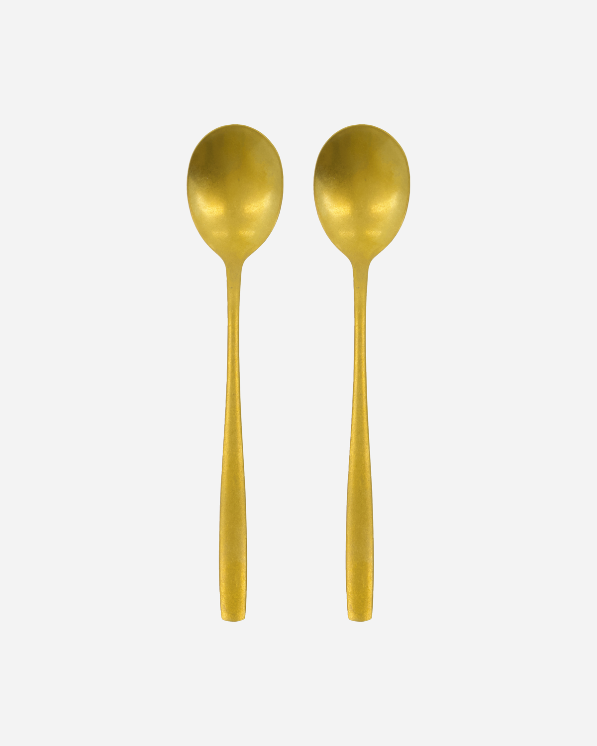 Add a touch of elegance to your dining table with this set of two spoons featuring an antique gold finish. Crafted from stainless steel, these spoons offer a robust yet sophisticated design, perfect for both serving and display. Make your meals memorable with these exquisite accessories.