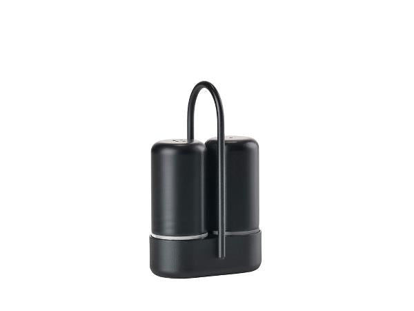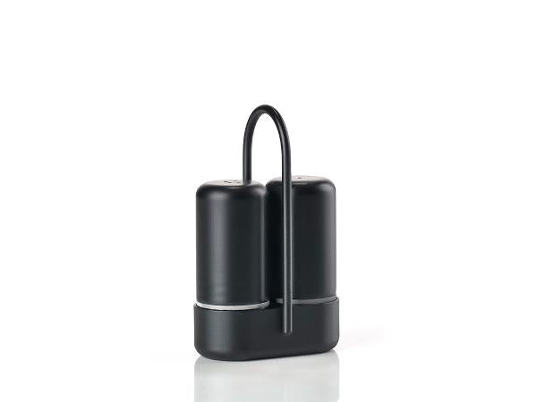 With this set remembering to put salt and pepper on the table just got easier. They are assembled in a nifty holder with handles so they can be moved with just one hand. A discreet ring makes it easy to tell salt and pepper apart.