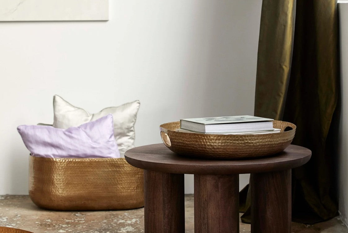 This round tray is made in aluminium with a handmade hammered pattern in natural brass colour.
