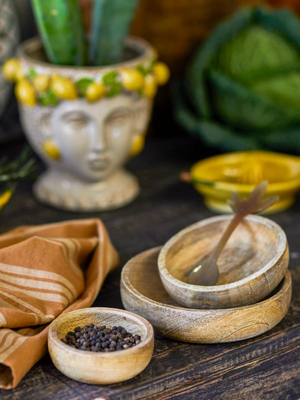 Set of three mango wood bowls each in its own size. The natural mango wood adds a warm and natural glow to your kitchen decor and table setting. Perfect for serving your favourite snacks.