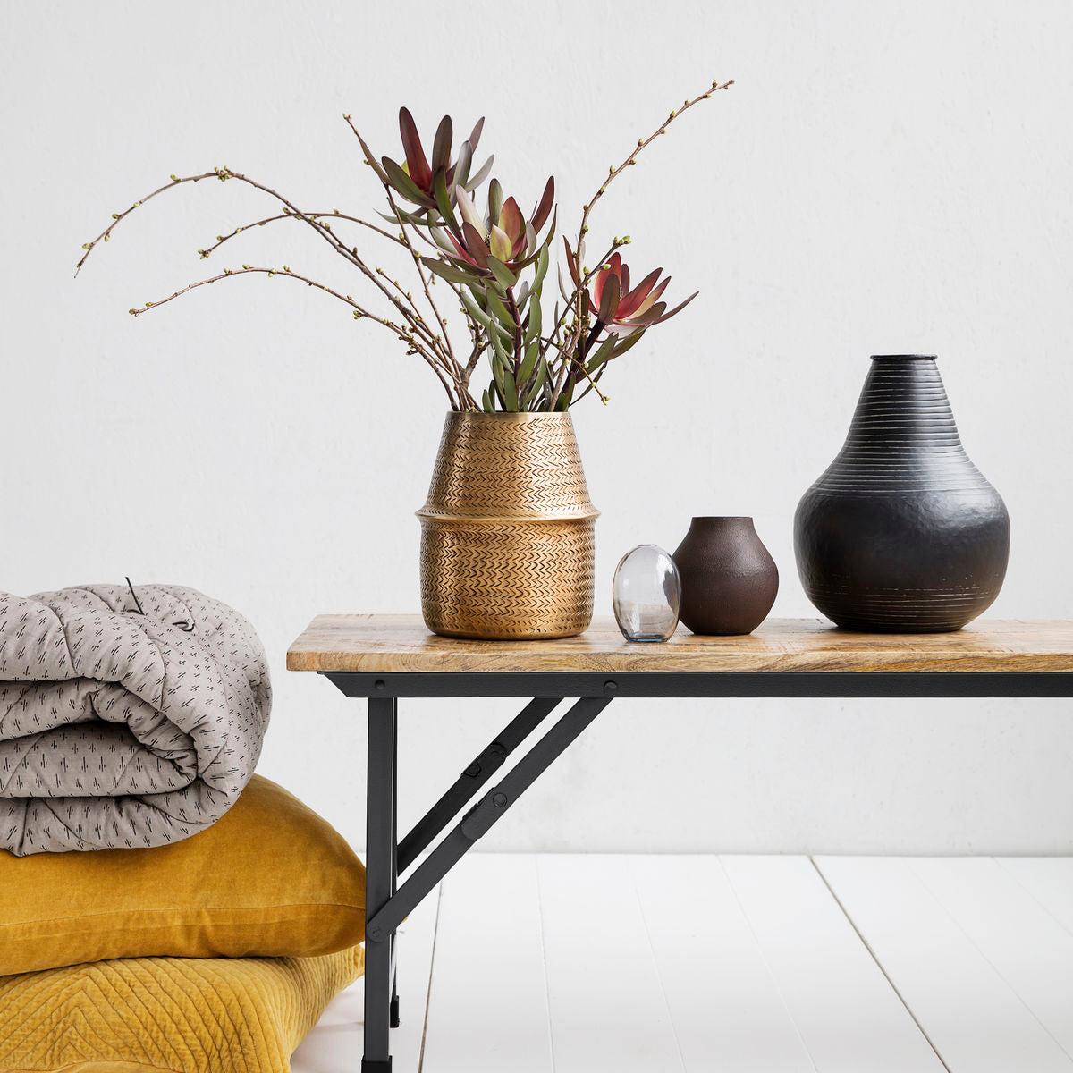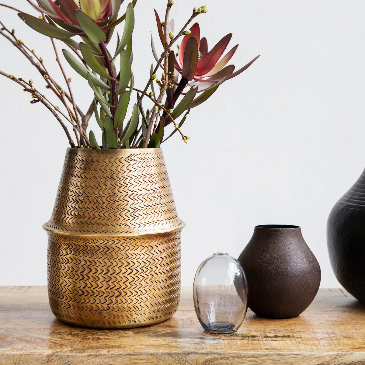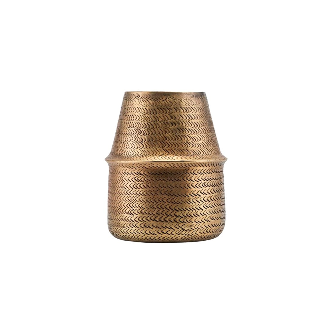 Add a lively touch to your home by bringing beautiful green plants into your home. With this stunning Rattan planter, your plants will create a magnificent atmosphere. Rattan is made of aluminium with brass coating giving it its unique look. The planter has an oblong shape, so by combining it with other plant pots and planters, you can create a look that is perfect for your home. Place it in your living room, kitchen or bedroom and add a cosy atmosphere to your home. The planter measures 19 cm in diameter and 23 cm in height.